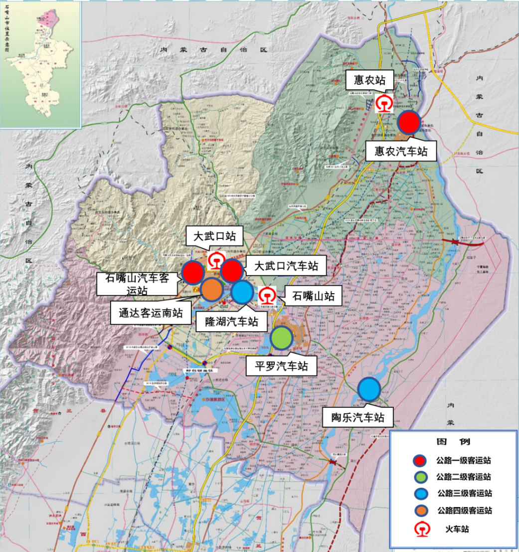 客运枢纽:截至2020年底,监控sh365下载_国外365平台_日博365.tv共有公路客运汽车站7个,其中包括一级站3个(石嘴山汽车站、大武口汽车站和惠农汽车站),二级站1个(平罗汽车站),三级站2个(隆湖汽车站和陶乐汽车站),四级站1个(通达客运南站);铁路客运车站3个,分别为石嘴山站、惠农站和大武口站,其中石嘴山站和惠农站位于包兰铁路线上,是目前监控sh365下载_国外365平台_日博365.tv主要的铁路客运车站。
